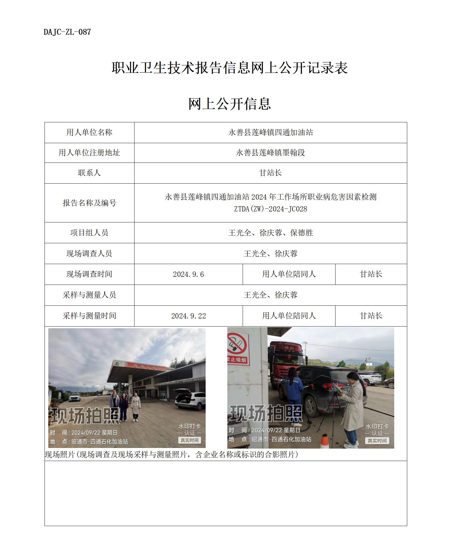 永善縣蓮峰鎮(zhèn)四通加油站2024年工作場所職業(yè)病危害因素檢測 ZTDA(ZW)-2024-JC028